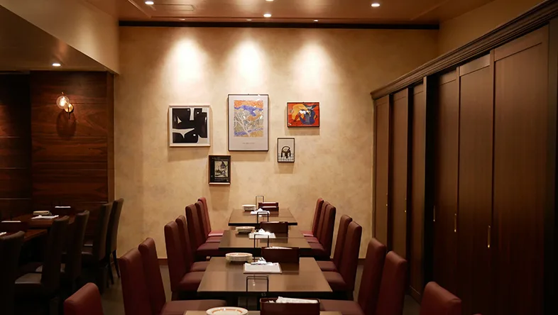 天井の低さを活かし、ライトの調整によってビストロならではの賑わいを表現。天井にはあえて艶を持たせ、ライトの反射を利用しています。深い茶色の木目にやわらかな光が当たることで、空間全体に温かみが広がります。テーブルや椅子、装飾小物に至る細部にまでこだわり、本場パリのビストロさながらの居心地の良さを生みだしました。